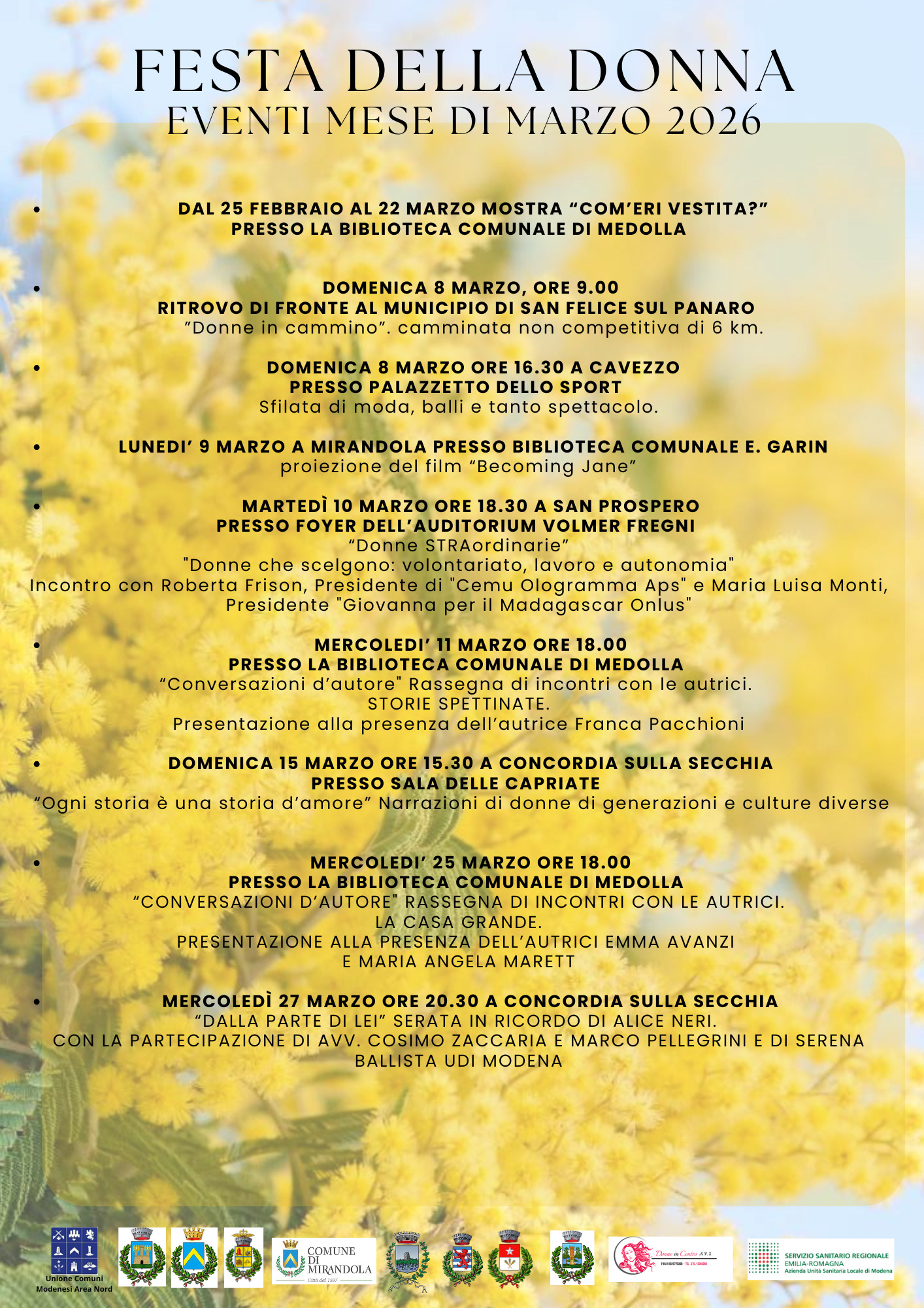 Anche quest’anno i Comuni dell’Unione Comuni Modenesi Area Nord propongono, nel corso del mese di marzo, un programma unitario di eventi culturali, incontri pubblici, momenti di partecipazione e iniziative di sensibilizzazione dedicate al ruolo delle donne nella società.