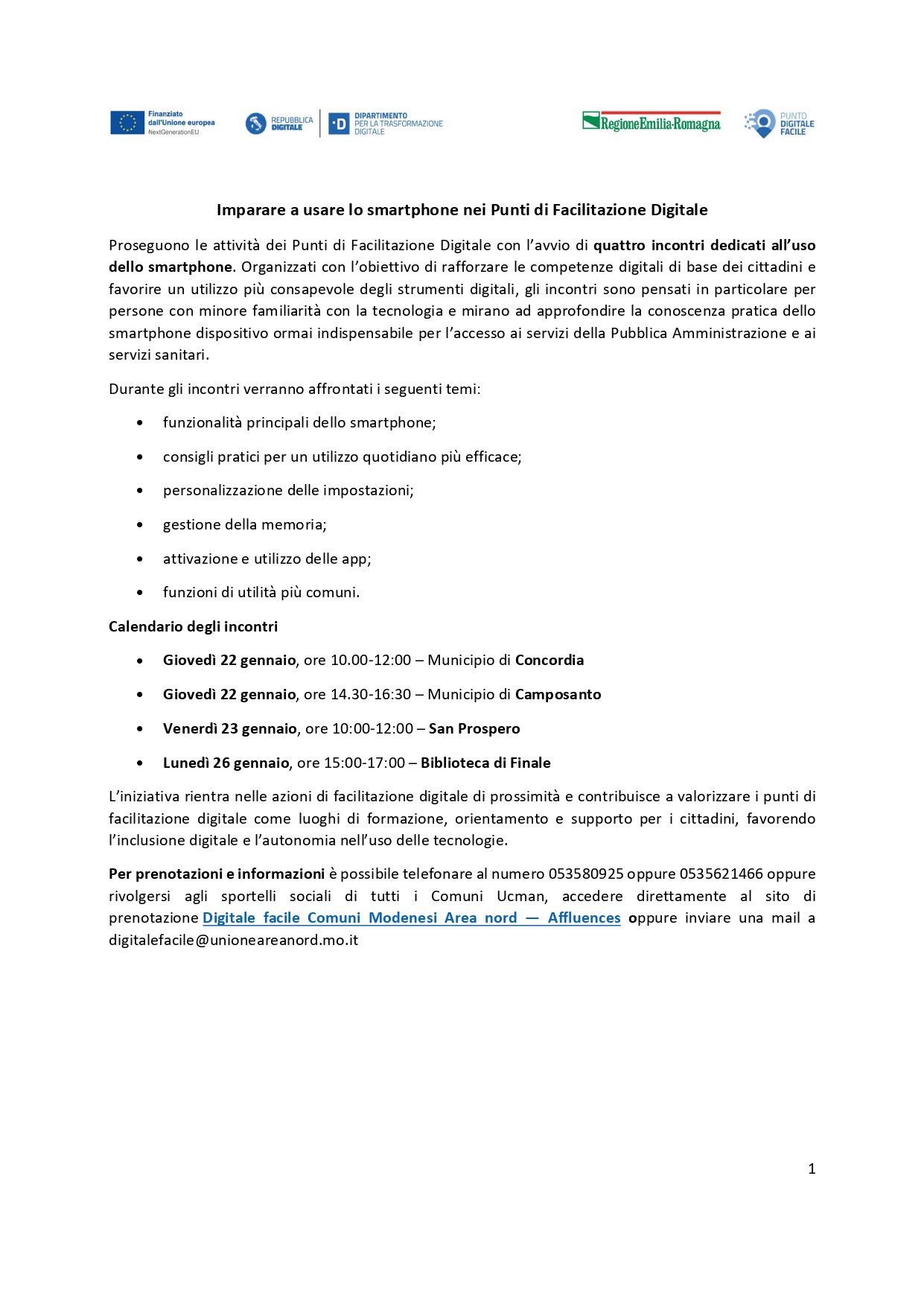 Per prenotazioni e informazioni è possibile telefonare al numero 053580925 oppure 0535621466 oppure rivolgersi agli sportelli sociali di tutti i Comuni Ucman, accedere direttamente al sito di prenotazione Digitale facile Comuni Modenesi Area nord — Affluences oppure inviare una mail a digitalefacile@unioneareanord.mo.it