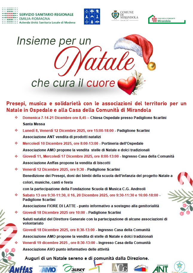 Il Distretto di Mirandola – AUSL di Modena in collegamento con gli Enti Locali rinnova anche quest’anno il proprio impegno nel valorizzare il ruolo della comunità e delle reti territoriali attraverso un articolato programma di iniziative natalizie realizzate in collaborazione con le associazioni del Terzo Settore. Le attività, ospitate presso l’Ospedale di Mirandola e le Case della Comunità di Finale Emilia e Mirandola, intendono promuovere vicinanza, solidarietà e partecipazione, offrendo ai cittadini occasioni di incontro e condivisione durante il periodo delle festività.Il calendario comprende momenti musicali, iniziative benefiche e piccole esposizioni, tra cui, a Mirandola, la mostra dei presepi allestita grazie al contributo della Consulta. Di particolare rilievo anche le attività rivolte ai più piccoli, come il progetto “Natale a colori”, che porterà in ospedale i doni e i lavori creativi realizzati dai bambini della scuola dell’infanzia, accompagnati da musiche e canti a cura della Fondazione Scuola di Musica C.G. Andreoli.Un ruolo centrale è svolto dalle associazioni del territorio – tra cui ANT, AMO, Anffas, AVO, Fiore di Latte, Pro Handicappati e Astronave Lab – che con i loro punti informativi, le proposte solidali e le attività di sensibilizzazione arricchiscono l’offerta di servizi e sostegno alla comunità. A completare il programma, i saluti natalizi del Direttore Generale, accompagnati dalla Banda Rulli Frulli, simbolo di inclusione e partecipazione giovanile.Attraverso queste iniziative, il Distretto di Mirandola – AUSL di Modena conferma l’importanza della collaborazione con le realtà locali nel costruire spazi di benessere condiviso, rafforzando il senso di appartenenza e la vicinanza alle persone e alle famiglie dell’Area Nord.