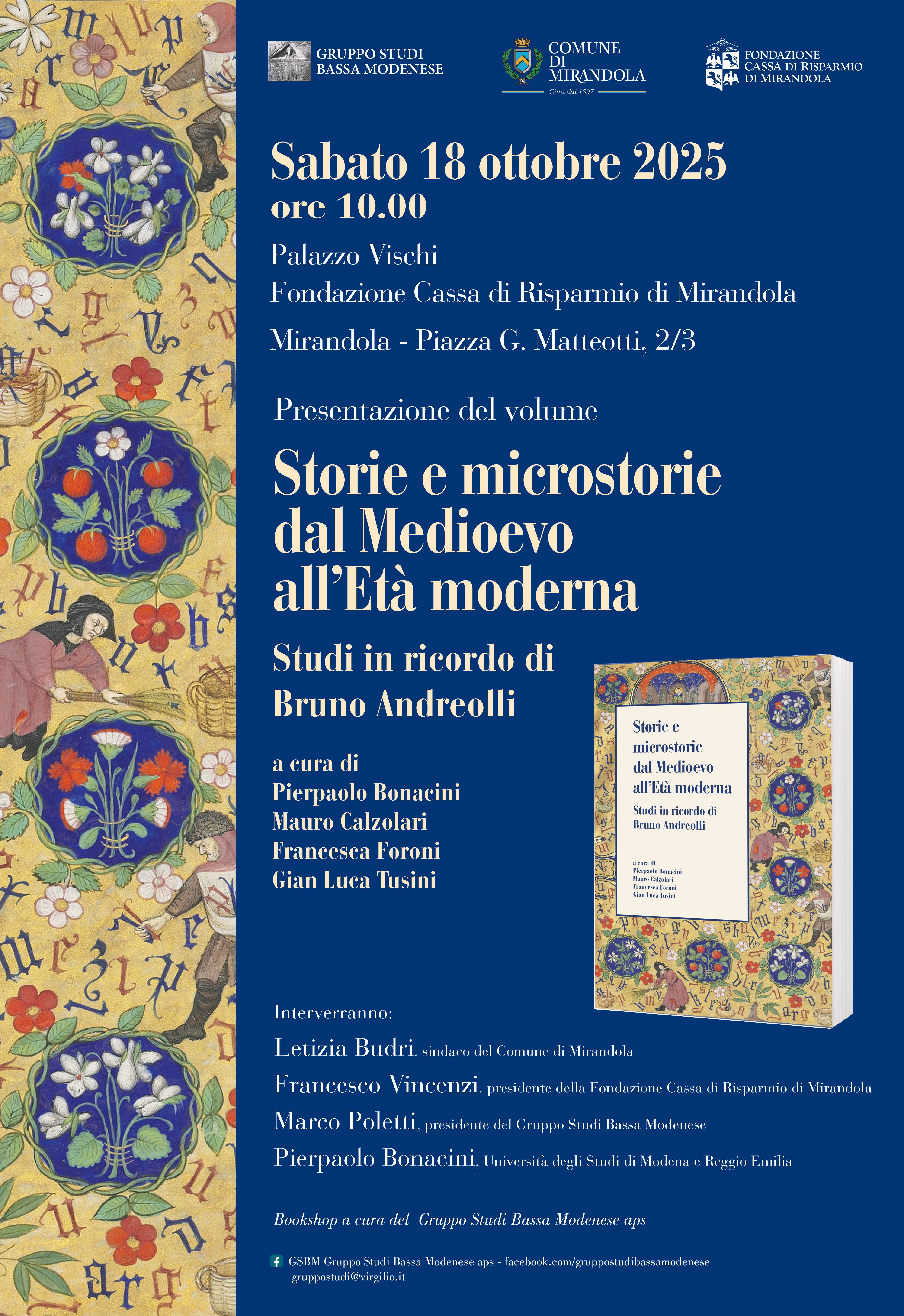 Presentazione del volume "Storie e microstorie dal Medioevo all’Età moderna. Studi in ricordo di Bruno Andreolli", che si terrà a Mirandola sabato 18 ottobre 2025 ore 10,00 presso Palazzo Vischi, sede della Fondazione Cassa di Risparmio di Mirandola, piazza Matteotti n. 2/3.