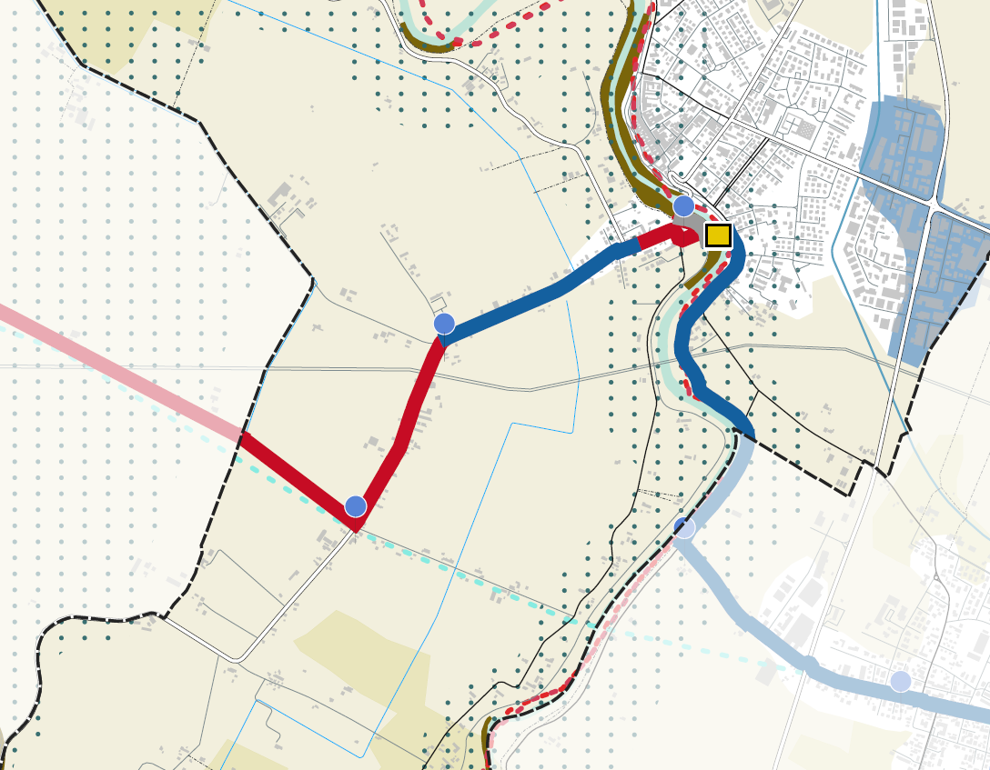 Il progetto prevede la realizzazione del tracciato ciclopedonale da ovest ad est, così da creare un collegamento diretto tra Novi di Modena, Concordia e San Possidonio. La parte di tracciato identificata in azzurro risulta già finanziata/altra progettazione con segnaletica di rafforzamento oggetto di contributo.